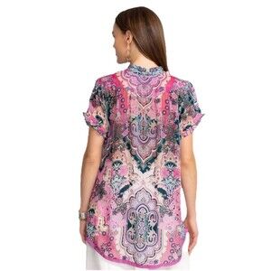 JOHNNY WAS Zoli Tape Hem Burnout Tunic Small Pink NEW Paisley Blouse Boho Chic