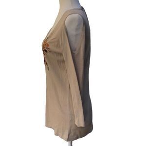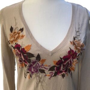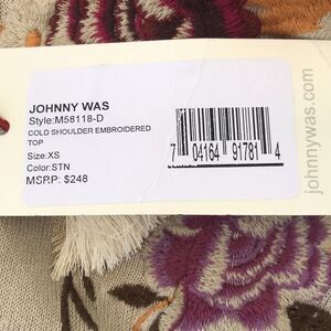 New with tags - JOHNNY WAS silk cashmere blend pullover knit sweater with floral embroidery. Cold shoulder. 3/4 sleeve. Women’s size XS