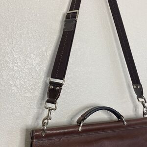 JOHNSTON AND MURPHY Brown Leather Briefcase in excellent used condition. Shoulder strap replaced.