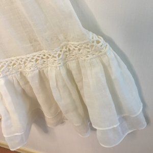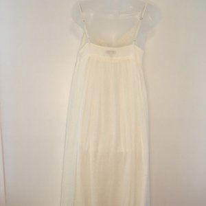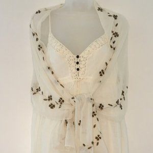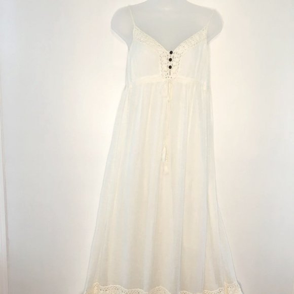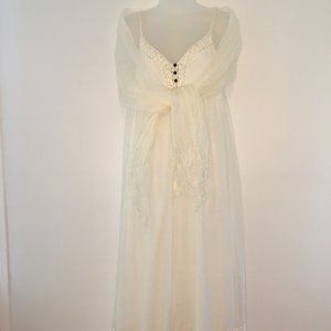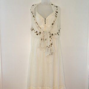 This White Cream color dress is perfect for a summer/Beach wedding. Very pretty on, Spaghetti straps (adjustable), has 3 tiny dk. brown buttons in front with empire waist that has 2 tassels flowing down. Fully lined, all 100% Cotton, dress has gauze look to the material. Has side zipper. Worn once . Comes with 2 shawls, one silky, the other gauze looking. No stains. 51" long, I'm 5'2". Purchased from Saks Fifth Ave.