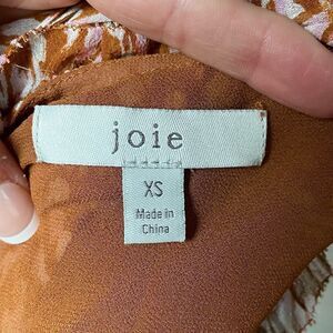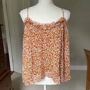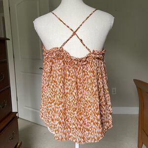Joie Ackley orange and pink print 100% silk loose fit tank with crisscross adjustable straps in back. Flowy. Ruffle across top hem. Excellent condition with no flaws.