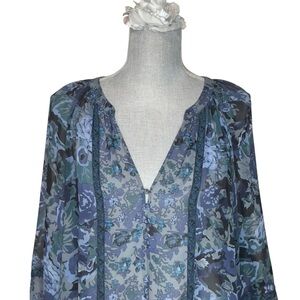 JOIE Anthropology Top Blue Green 3/4 Long Sleeve Silk Florals size M
