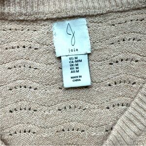 Add a touch of timeless charm to your wardrobe with this Joie beige knit sweater. Featuring intricate scallop-like patterns, puffed half sleeves, and a ribbed hem, this sweater is perfect for casual and chic looks alike.