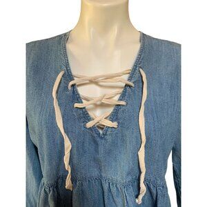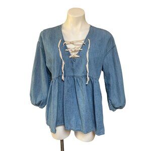 JOIE women's "baby blue Bealette blouse" in denim-look chambray. This lightweight, breezy bohemian peasant shirt is a perfect companion to your favorite jeans or peasant skirt. Slight Western look. Adjustable lace up V neckline.