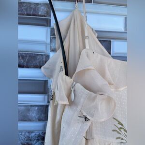 Straps down to bottom of hem 56”+ with adjustable straps . Cream color.
