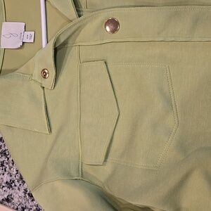 Pre-owned. Good condition. There is 1 small pull on the bottom front right side as shown in the pictures. ( barely noticeable) No other flaws. 2 front flapover pockets on the chest. Snap button sleeves. 4 snap button closure. Color is a lime green, but some pictures are showing up different. Super soft and silky. The jacket seems a little cropped. Please see measurements......