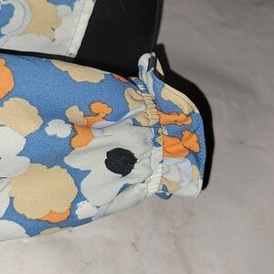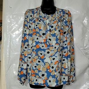 Keywords: floral blouse, long sleeve top, tie neck blouse, bohemian top, casual blouse, floral print top, womens blouse, blue floral top, ruffled cuff blouse, boho chic, spring blouse, summer blouse, fall blouse, lightweight blouse