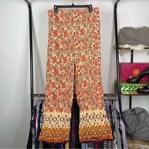 Elastic built into waist. Red, pink, black, matron, orange, and yellow print. Functional side pockets. Very lightweight and airy. 100% rayon.
