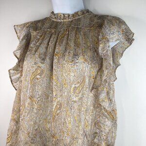 JOIE GLITTER PAISLEY RUFFLE MOCK NECK FLUTTER SHORT SLEEVE BLOUSE Size M