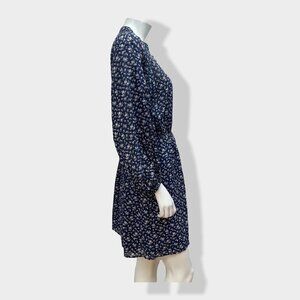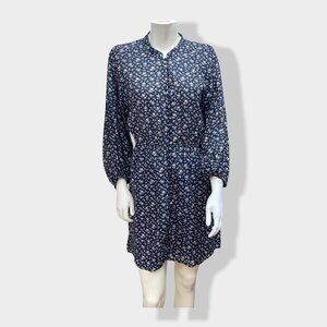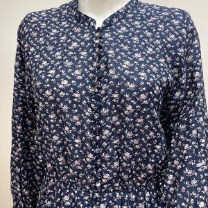 Dark blue with small dainty floral print. Mandarin collar, gathered cuffs with long sleeves, button closure, cinched waist. Cotton blend.