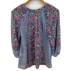 Beautiful mixed georgette prints refresh a luxe silk top crafted with a graceful, flowing loose easy silhouette and framed with three-quarter-length blouson sleeves.