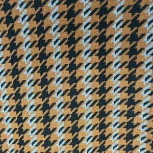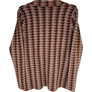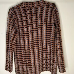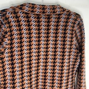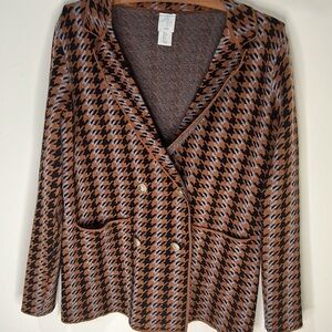 Joie double knit blazer is rust, black, gray houndstooth check. Lapels, beautiful brass buttons, two patch pockets.