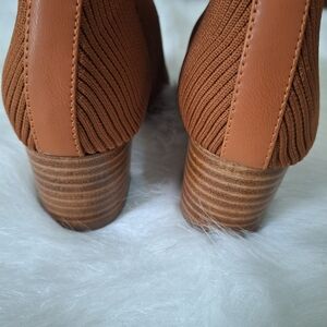 Chic and cozy ankle boots featuring a ribbed knit sock upper in a rich rust hue. These pull-on booties offer a snug, stretchy fit with a stacked block heel for added comfort and style. The all man-made material construction makes them lightweight and vegan-friendly. Light wear to soles, uppers are in excellent condition.