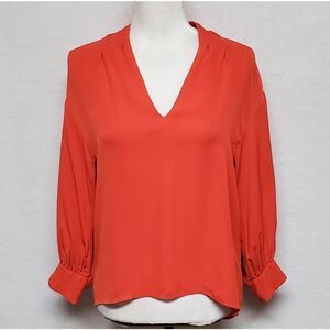 - From Website - A silk twist on the classic v-neck, this long-sleeve blouse is cool-weather-ready with a delicately tailored sleeve and flattering silhouette. perfect for wearing over skinny denim.