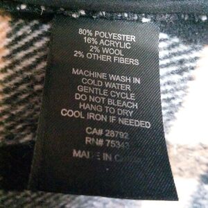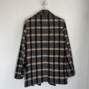 Black and tan plaid, notched collar, slouchy, draped, open front, wool blend jacket with pockets and no lining.