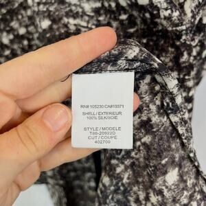 Scoop neck, dolman cap sleeves, relaxed fit, pullover style, hook-and-eye closures up the back. Gray / white abstract print. 100% silk.