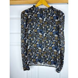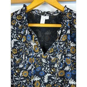 Black with blue and bronze floral print. Swiss dot fabric. Ruffled split neck with tie detail. Sheer long sleeves. Slightly puffed shoulders and lined bodice