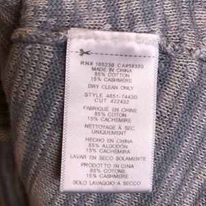 Super soft and flowy, scoop neck tunic sweater finished in a raw, asymmetrical hem. Color is antique white and dusk. Color is a light blue as shown in stock picture #1. Style 4851-7443D. 85% cotton 15% cashmere. 20" armpit to armpit, 24" length, 30" length, 23" sleeves. Excellent condition.