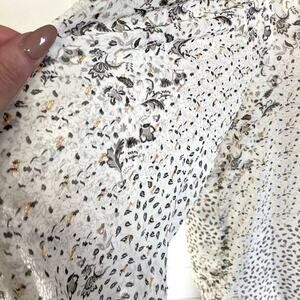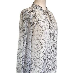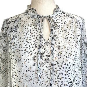 JOIE Women's Semi -Sheer elegant blouse with black and gold floral accents. Ruffled neck collar and button cuffs. Lined with sheer long sleeves. A rare find! Colors are off-white/cream with black and gold foliage/floral design print.