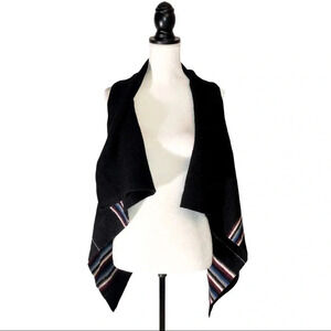 JOIE • 100% Wool, “Ligiere” Southwestern, Color-block, striped wrap vest - Snap button to close. Loops along the waist to pair with belt of choice! Drape front. Great layering piece for winter.