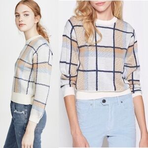 JOIE Wool Plaid Check Knit 3/4 Long Sleeve Crewneck Cropped Pullover Sweater XS