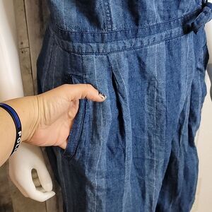 Jumpsuit Striped Linen and cotton-blend Cropped Two front slant pockets Two back welt pockets Ties at waist Non-stretchy fabric Mid-weight fabric Machine wash Imported. Name tag is hanging on one side. Can be stitch if want to