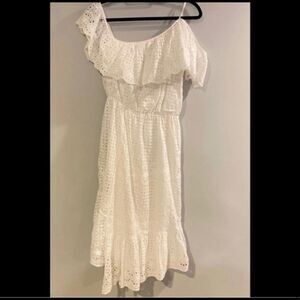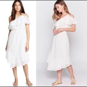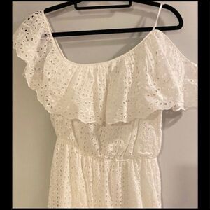 This off-shoulder, ruffles-for-days dress has all the feminine details we love from the asymmetric flounce hem to the pretty lace-inspired detailing. itâs one of those âdress up any occasionâ options that looks as great with a pair of greek sandals as it does with your favorite heels.