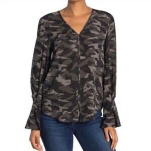 Joie Laiticia Green Camouflage Caviar Bell Sleeve V Neck Blouse. Long sleeve. allover camo print. Size womens Small.