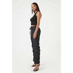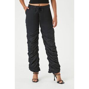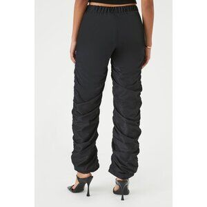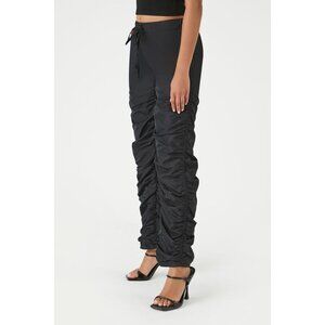 A pair of woven joggers featuring an elasticized drawstring waist, slanted front pockets, and ruched leg design.