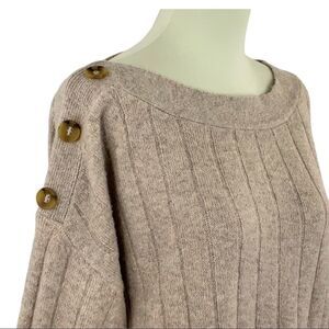 Beautiful super soft popover sweater with cute button detail on the shoulder with a raw edge hem.