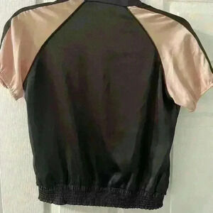 JOLT Jacket With Front Embroidery - Satin in black with blush color at shoulder.
