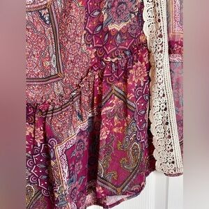 Perfect paisley print kimono. Features crochet detail. Pair with a tank top and jeans. Great condition.