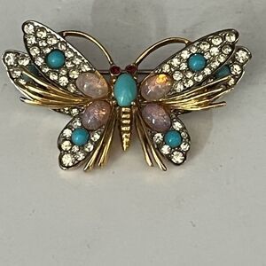 This JOMAZ brooch is gorgeous and in great condition. It has white rhinestone, turquoise and opals on the wings, red rhinestones eyes and it is gold and silver tone.