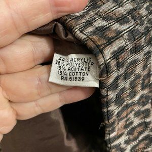 BROWN, BLACK & GRAY ANIMAL PRINT WITH FLORAL RED PATCHES WITH SEQUINS SEWN ON. BUTTONS DOWN THE FRONT WITH 2 POCKETS. MADE OF ACRYLIC, POLYESTER, ACETATE & COTTON.