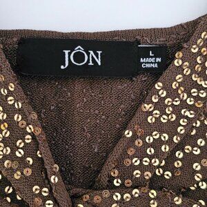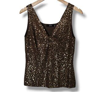 JON Sleeveless Top Size L Brown Gold Sequin Knot Twist V-Neck Fairy Whimsy Shine