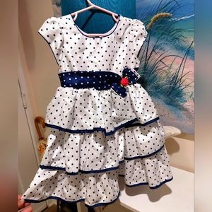 BY JONA MICHELLE CUTE FORMAL WHITE / NAVY BLUE DOG FABRIC RUFFLE FLOUNCY DRESS UNDERLINED WITH TULLE AND REG COTTON LINING BUTTON AND TIE BACK..SIZE 3T..GREAT FOR SPRING SUMMER FORMALS LIKE WEDDINGS, PARTYS, AND CHURCH..NICE PRELOVED CONDITION