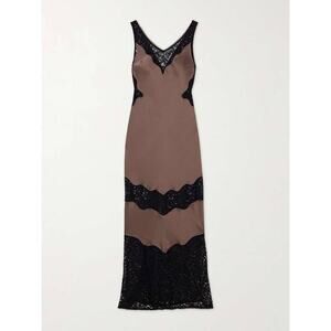 adorned with black lace panels at the hem, midline, waist, and bodice concealed back zipper