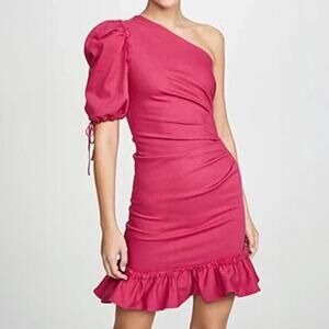 Jonathan Simkhai hot pink one-shoulder denim mini dress. Stretch denim fabricaation. Pleated detailing at side. Frayed trim. Ruffle hem. One-shoulder neckline with short puff sleeve and ruching drawstring at cuff. Exposed zip at side. In great condition. Size 8 - 16.5" pit to pit; 13.5" waist; 28" length from pit.
