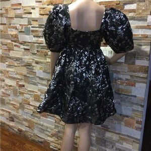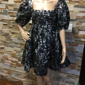 Elegant black dress with silver accents. Features puff sleeves and a square neckline. 66% polyester, 34% nylon. Lining 100% polyester. Pit to pit 16 inches, length 33,5 inches. Excellent condition.