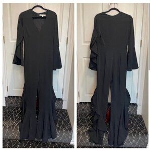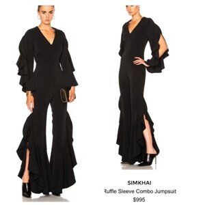 SIMKHAI Ruffle Sleeve Combo Jumpsuit $995 One of the coolest pieces I’ve ever listed! 51% acetate, 46% viscose, 3% elastan Lining: 96% poly, 4% elastan Dry clean only Ruffle trim Hidden back zip closure Side leg slit detail with tie closures Arm slit detail Back zipper