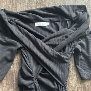 Off the shoulder rib-knit jersey dress with cutout detail at the bust and ruching over the hips.