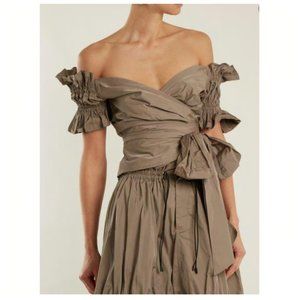JONATHAN SIMKHAI Taffeta Ruffle Wrap Tie Off Shoulder Cap Sleeves Crop Top