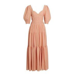 Elevate your wardrobe with this Jonathan Simkhai tiered maxi dress. Its delicate puff sleeves, flattering silhouette, and soft peach hue exude timeless elegance for day or evening wear.