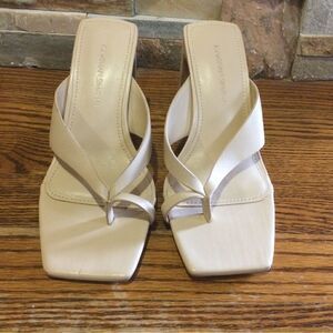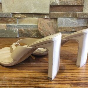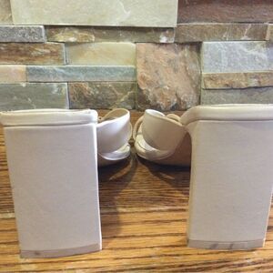 Good condition. The Evangeline Sandal in Taupe. Square toe, heeled slip-on sandal. Heels 4”. Napa leather with lamb skin upper. There is some minor damage on the heel.