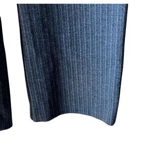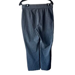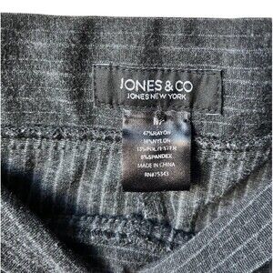 Elevate your business casual wardrobe with these gray pinstriped straight leg stretch pants from Jones New York. Perfect for any occasion, whether it be a wedding or workwear, these dress pants feature a comfortable pull-on closure and flat front design. The pants have a regular fit and a mid-rise waist with a laying flat measurement of 15 inches. The inseam measures 26.5 inches and is made with 47% Rayon, 14% Nylon, 13% Polyester, and 6% Spandex material (that's not 100% but that is what the tag says), ensuring both comfort and style. These pants have a striped pattern and a timeless business theme, making them a great addition to any wardrobe. The garment care for these pants is easy as they are machine washable. The pants come in a size M. Add these stylish pants to your collection today and take your business casual look to the next level!