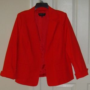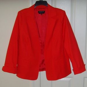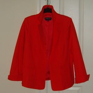 JONES NEW YORK Collection Woman - 18W - Vibrant tomato red blazed with roll cuff sleeves. Stretchable fabric made of 97% cotton and 3% spandex. Very good pre-owned condition. May need to be cleaned due to normal (very little) wear around collar. Otherwise in pristine condition. All measurements are as follows: