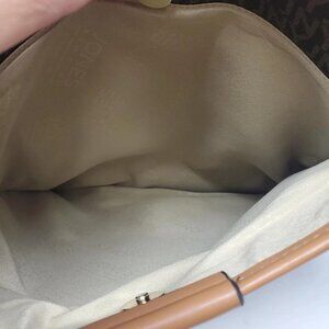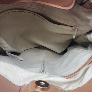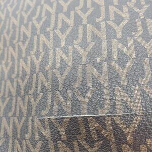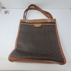 HANDBAG: JONES NEW YORK MODEL HANDBAG, BROWN - DARK, CANVAS, TOTE, SHOPPER, 12X3X14, DAMAGED, 1 @ HANDLE, 1 ON THE BACK, MIDWAY DOWN - SEE PHOTOS - PRICE REFLECTS DAMAGE