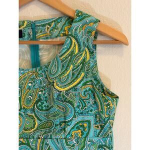Jones New York Signature women's sheath dress, size Petite 6P. Beautiful paisley floral pattern in vibrant yellow, green, and blue. Sleeveless with a classic sheath silhouette, back zipper closure, and stretch fabric for comfort (98% cotton, 2% spandex). A chic, versatile piece—perfect for office attire, vacation wear, or Old Money Euro inspired style. Like new condition.