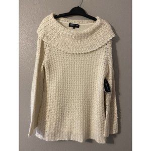 This luxe sweater is by Jones New York in a misses size extra large. Two pieces, inner cami shell and outer sheer sweater. The color is called "Winter White" which is a light cream with shimmers of silvery white. The sweater is a pull on style with wide fold-over neckline. There is an optional matching belt.