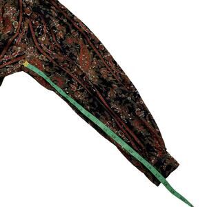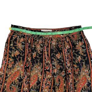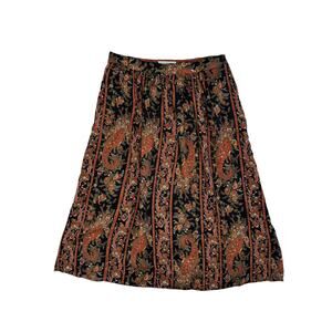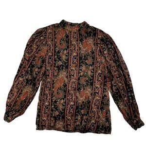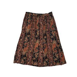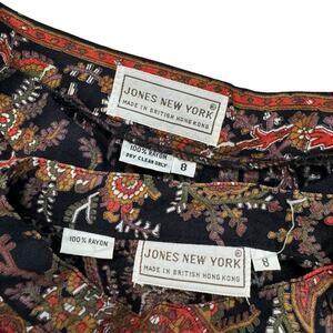 JONES NEW YORK Vintage 1980s Black Fall Paisley Skirt Set. Vintage size 8 Women’s. High neck with asymmetric button up. Black background with orange, red, purple, white paisley print. Long sleeve. Knee length skirt. 100% rayon. Made in British Hong Kong. Excellent condition — no rips, stains, or holes.